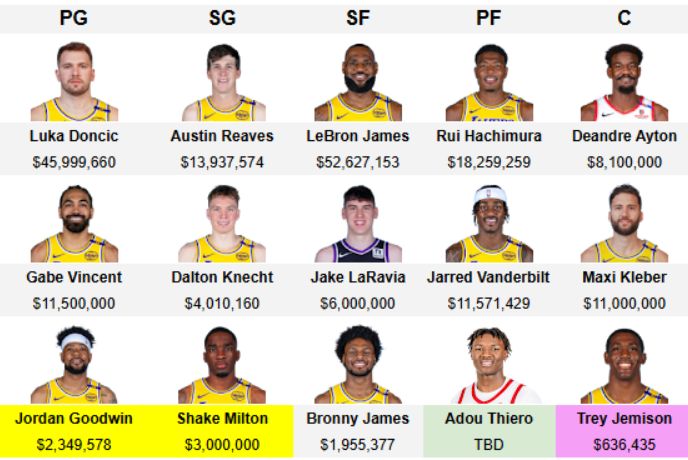 有美媒晒出湖人目前的阵容,让大家预测新赛季的胜场数。这笔签约似乎解决了湖人队今夏面临的最大问题——谁将担任中锋?上赛季末,湖人队在对阵森林狼队的最后六节比赛中,将首发球员海耶斯摁在了替补席上。